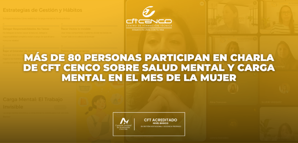 En el marco de la conmemoración del Mes de la Mujer, CFT CENCO realizó la charla “Salud mental y emocional de la mujer: carga mental: el trabajo invisible”, instancia dirigida a toda la comunidad, enfocada en visibilizar la carga mental y sus efectos en la vida cotidiana.